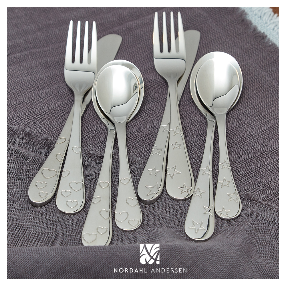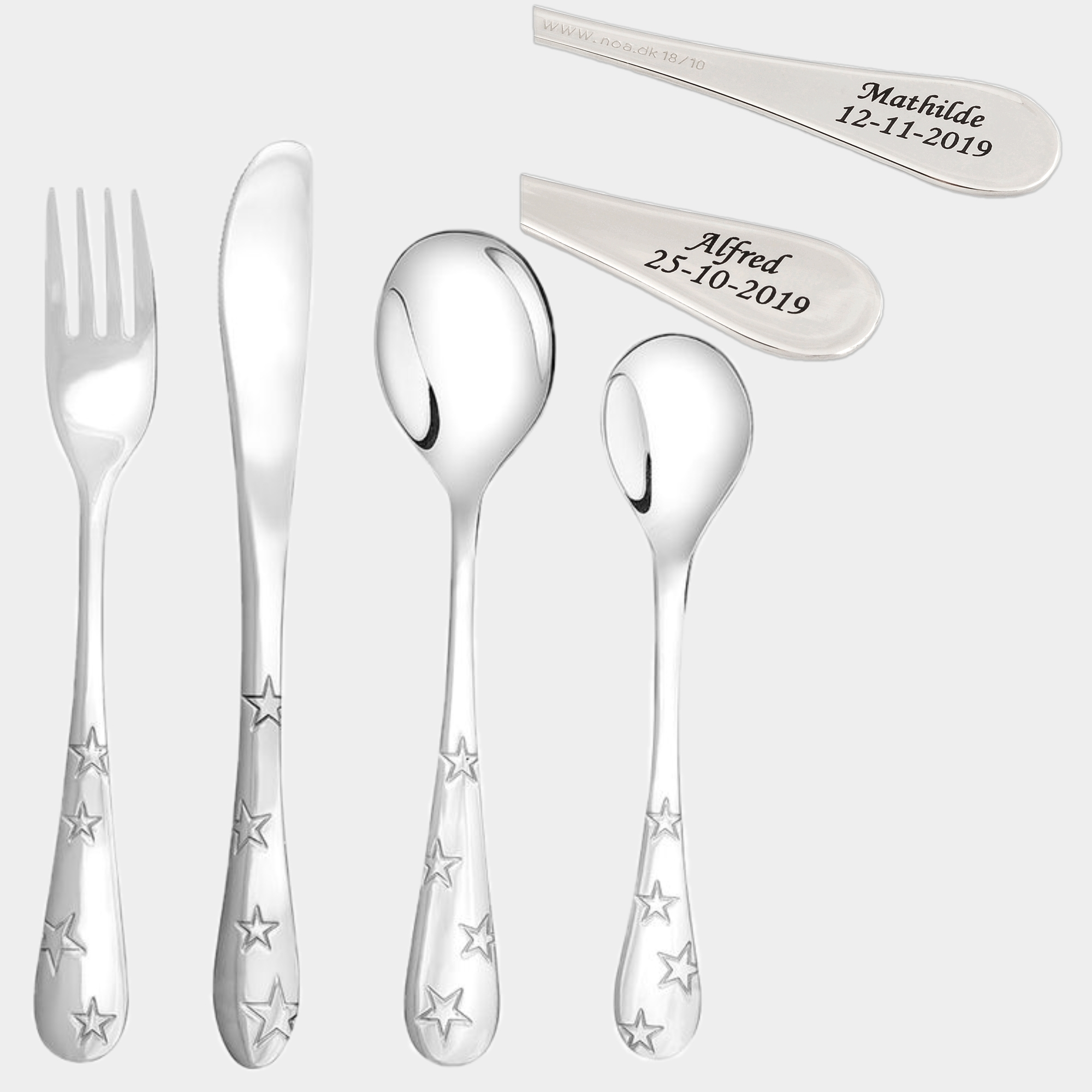 Fint gavesæt med 4 dele bestik, der er dekoreret med stjerner. Du får gratis gravering af fornavn og evt. dato på bagsiden, så du har en perfekt gaveidé til barnedåben, fødselsdage eller navngivning o.lign.