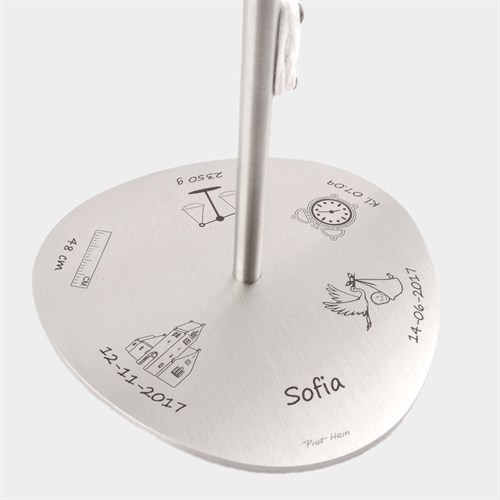 En klassisk dåbsgave med en personlig inskription i foden af denne elegante flagstang fra Piet Hein. Du får gratis gravering med i prisen af dette dåbsflag, som indeholder barnet personlige oplysninger; navn, fødselsdato, klokkeslæt, vægt, størrelse og dåbsdato. Hertil følger søde tegninger, som er lasergraveret i flagstangens fod, så den fremstår med en fin sort inskription.