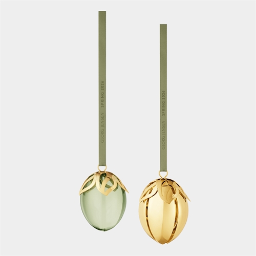 Pynt op til påske med Georg Jensens 2026 påskeophæng. Byd foråret indenfor med dette smukke 18 karat guldbelagte påskeæg med smukke detaljer og lysegrønt bånd. Designet er inspireret af årstidens blomster og en del af Georg Jensens forårskollektion 2026.