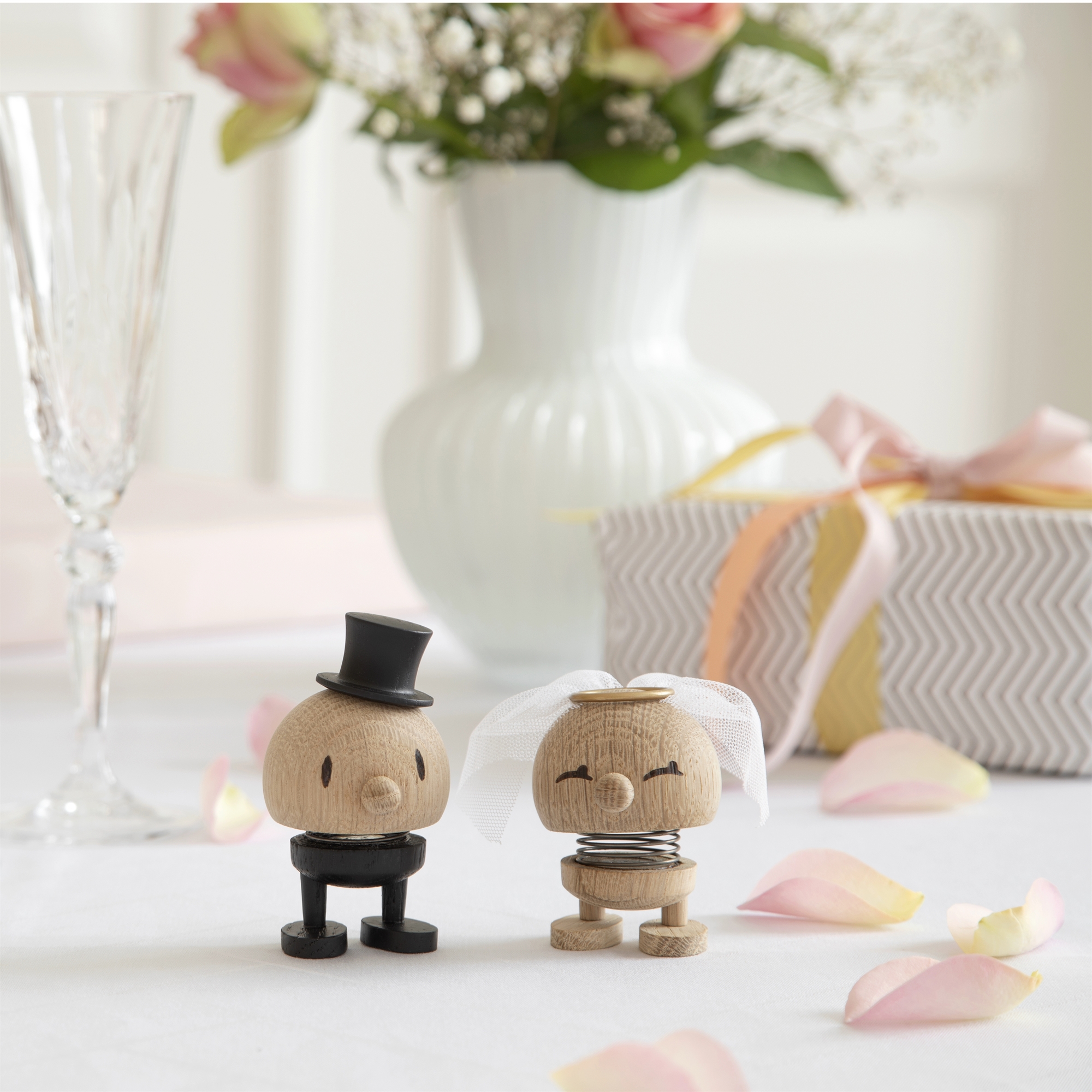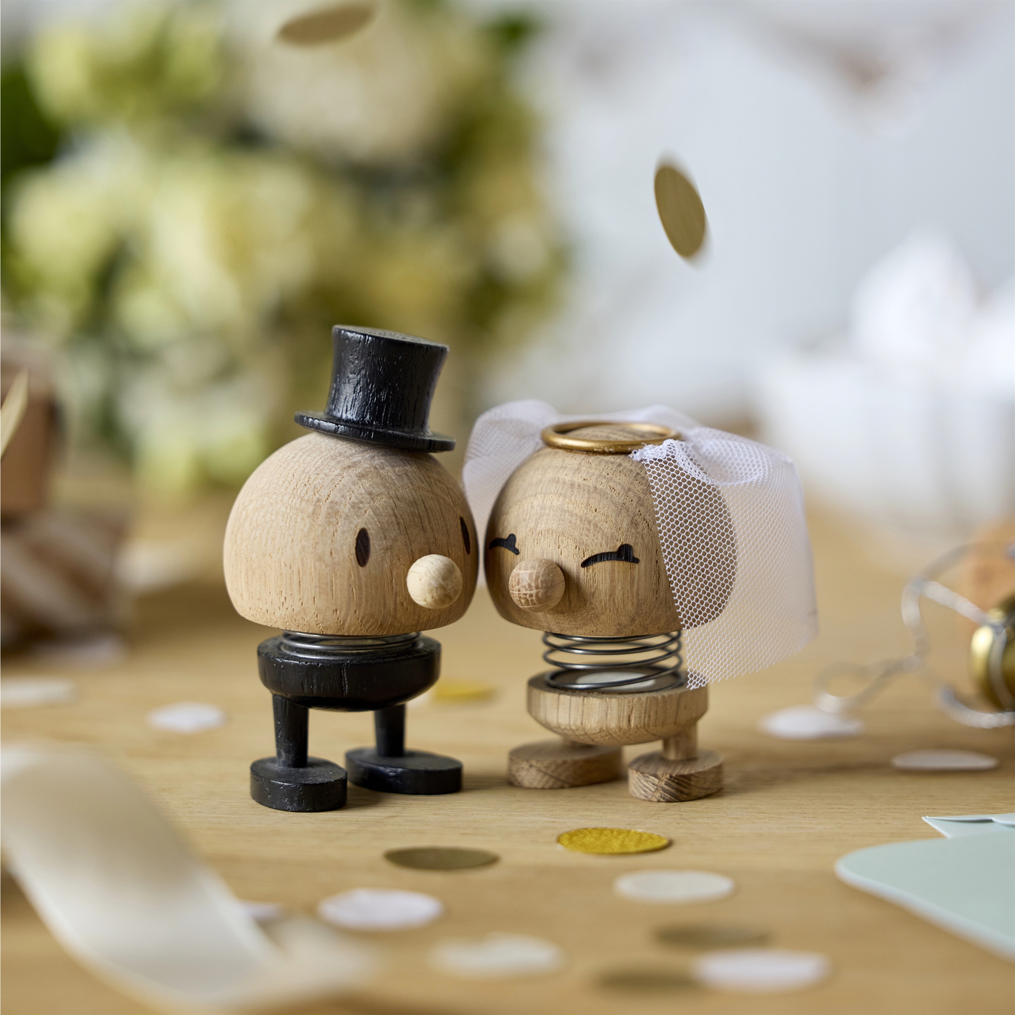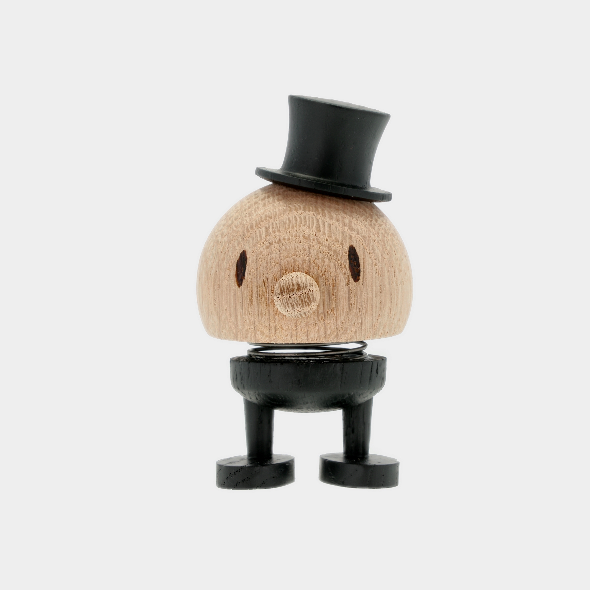 Den hoptimistiske brudgom hopper løs, fordi han skal giftes. Glæd gommen med denne fine hoptimist klædt i sort malet dragt og høj hat i flot kontrast til den lyse rå egetræ.