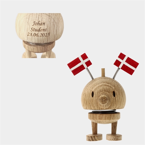 Få en gratis gravering af fx navn og en dato eller anledning på Hoptimistens bagside, så får du en ekstra personlig Hoptimist. Du kan få op til 3 linjers gravering med max 12 tegn i hver linje inkl. mellemrum. Vi lasergraverer din tekst, som brændes ned i træet og efterlader en brun/sort inskription afhængig af træets nuance.