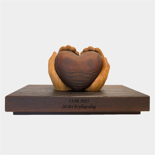 Figuren med hjertet i hænderne er fremstillet i lys ask og mørkebrun egetræ 100% FSC certificeret.